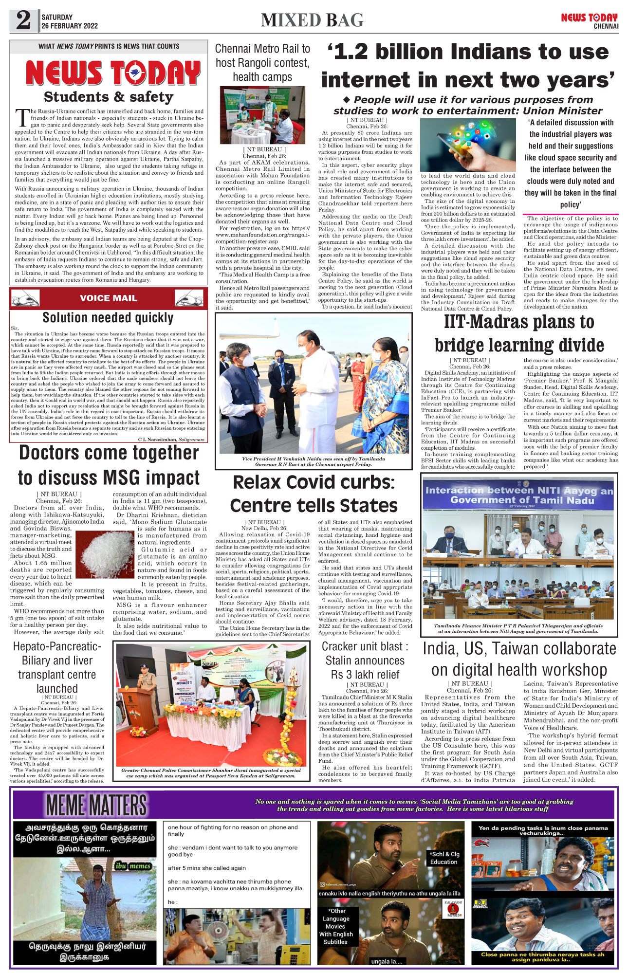 E-PAPER 26- February-2022 Spread the love Spread the love By NT BureauPosted on February 26, 2022February 26, 2022 #MKStalin #Ukrainewar #Putin #Modi #Mullaiperiyarreview #Russia #UN #Tirumurti #DJayakumar #Rahul #Savarkar #Birsa #PaRanjith #Taapsee #Tabu #BhoolBhulaiyaa2 #Kharkiv
