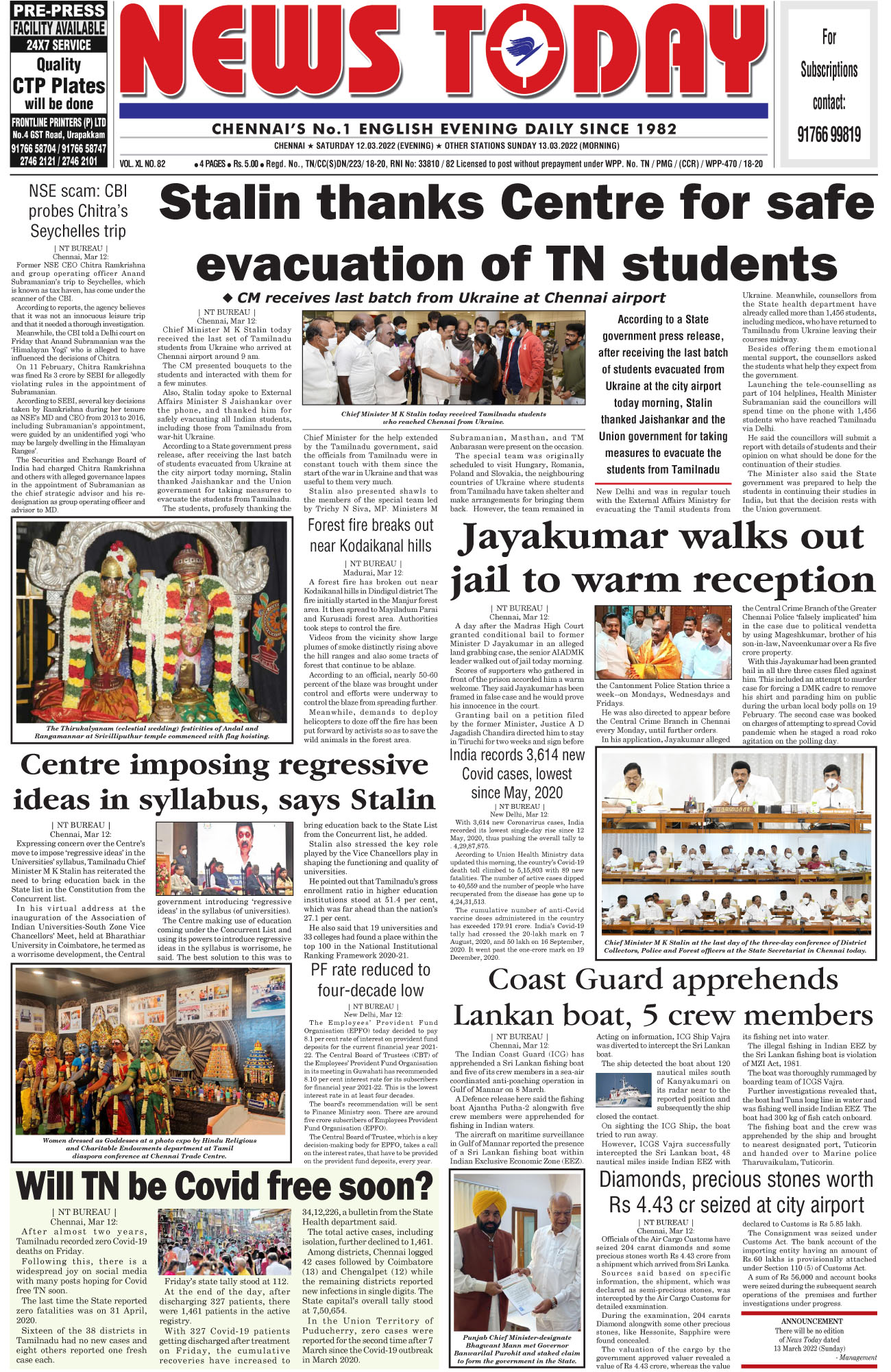 E-PAPER 12- March-2022 Spread the love Spread the love By NT BureauPosted on March 12, 2022 ChitraRamkrishna, MKStalin, newstoday, newstodaynet, newstodaynet online, NSEscam, Ukrainecrisis