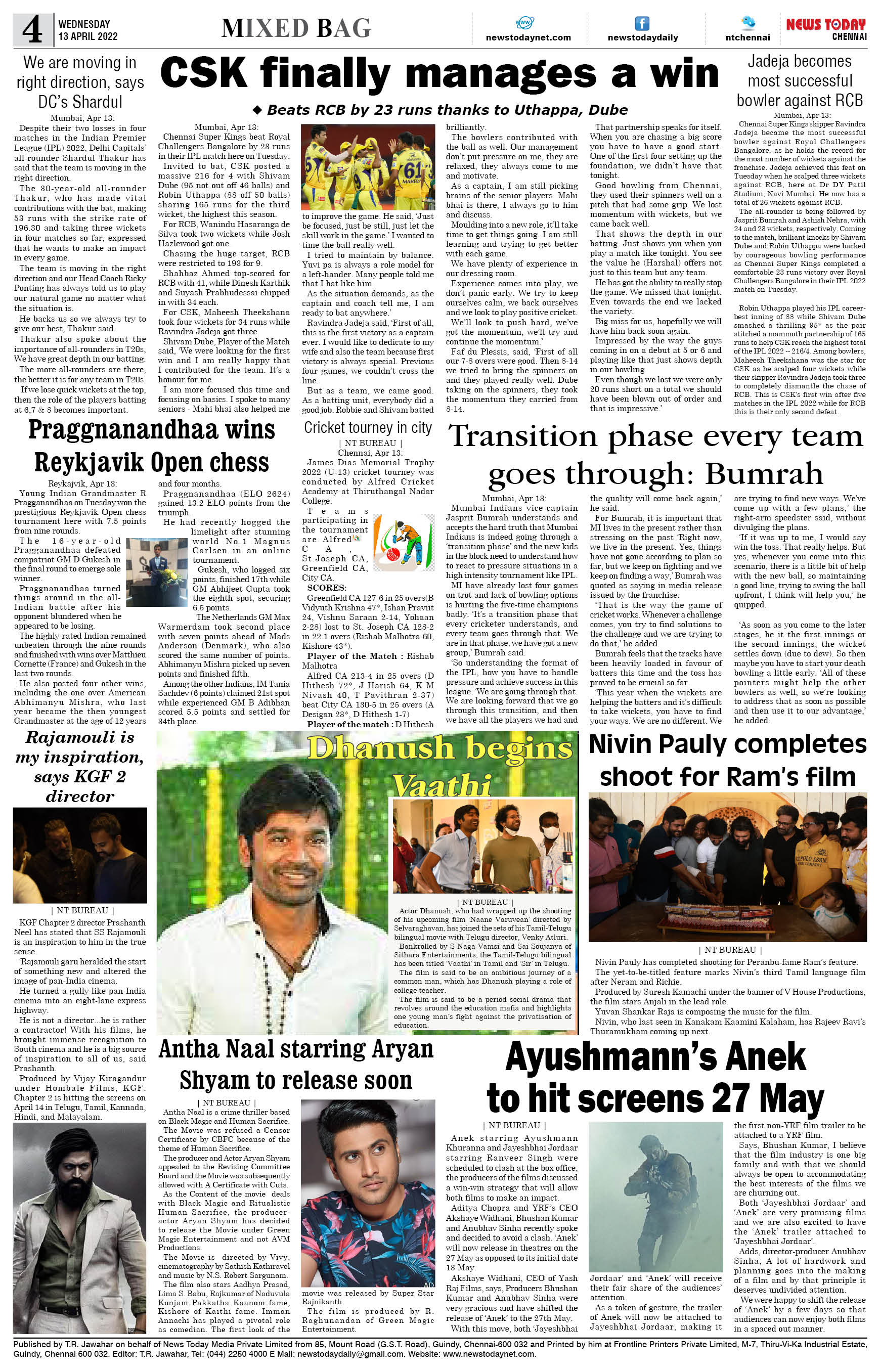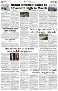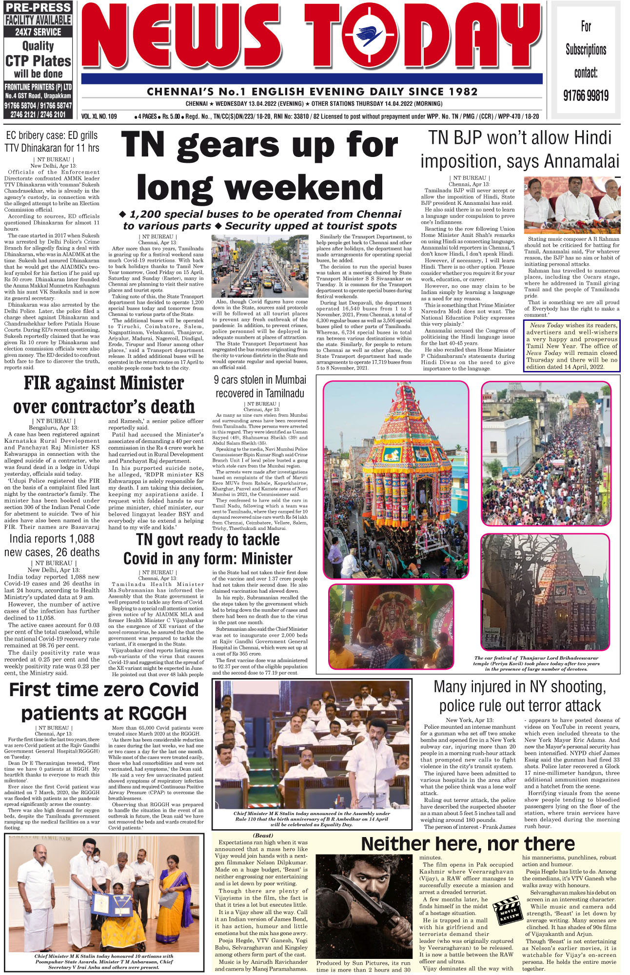 E-PAPER 13- April-2022 Spread the love Spread the love By NT BureauPosted on April 13, 2022April 15, 2022 Annamalai, Aryan Shyam, Beast review, cars stolen, Covid Zero, dhanush, ED grills, Eshwarappa, Hindi impose, KGF 2, MKStalin, retail inflation, Subramanian, Thanjavur car, TN gears