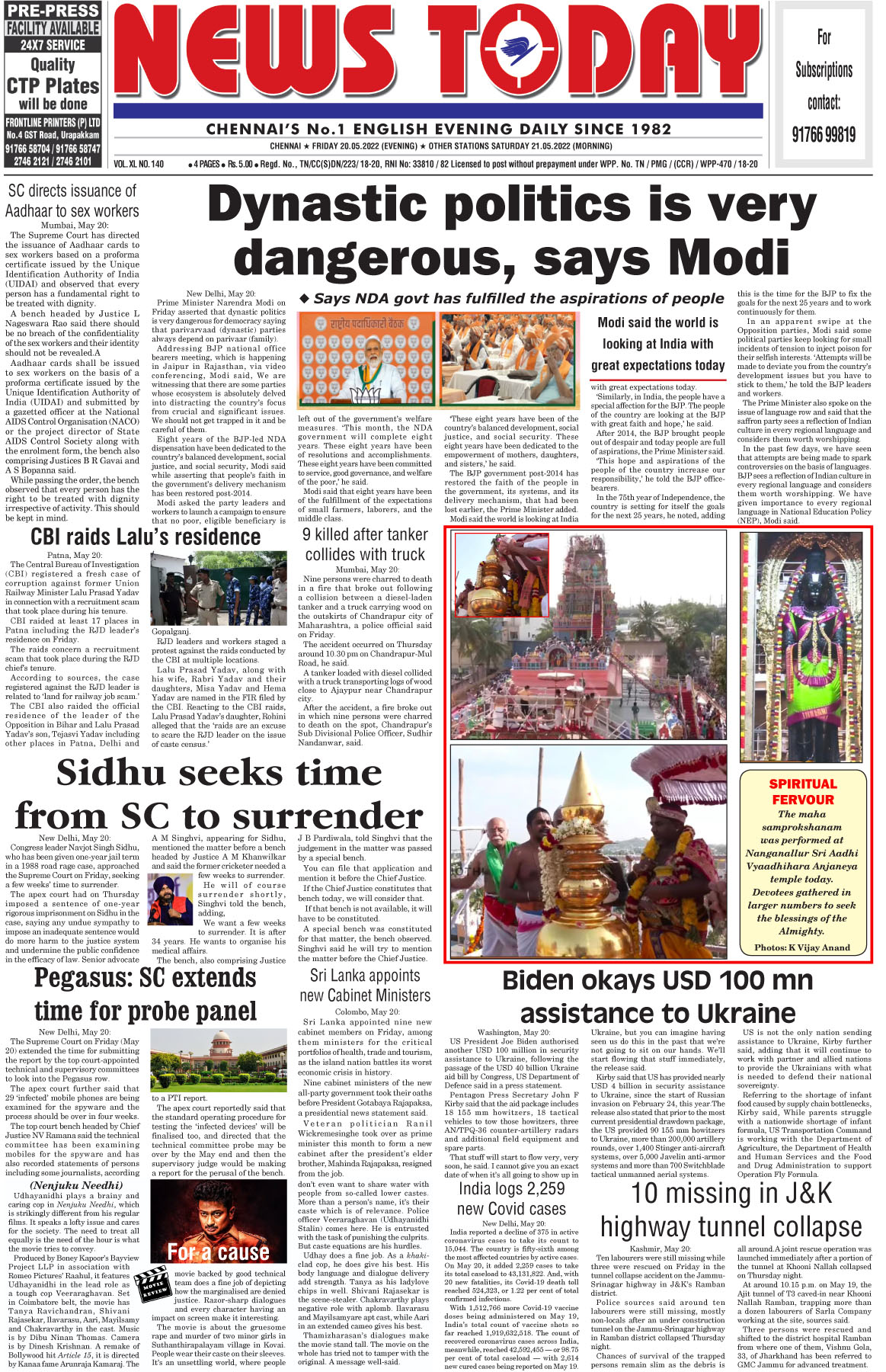 E-PAPER E-paper | 20- May-2022 Spread the love Spread the love By NT BureauPosted on May 20, 2022 CBI raids, Lalu, modi, Nenjuku Needhi, sc, Sidhu, stalin