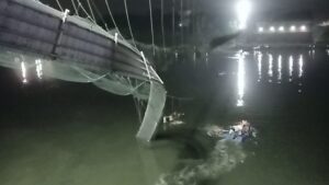 The death toll in Morbi suspension bridge collapse in Gujarat rose to 130 on Monday with rescue personnel recovering more bodies from the Machchhu river, a police official said.The over a century-old bridge, which had reopened five days ago after extensive repairs and renovation, was crammed with people when it collapsed around 6.30 pm on Sunday.”At least 130 deaths have been reported so far,” the official said.Gujarat Minister of State for Home Harsh Sanghavi told reporters at Morbi, around 300 km from the state capital, that the state government has formed a committee to probe the collapse.Eyewitnesses said there were several women and children on the British era “hanging bridge” when it snapped, plunging them into the water below.Some people were seen jumping on the bridge and pulling its big wires, an eyewitness said, adding the bridge may have collapsed due to the “huge crowd” on it.After the collapse, all that remained of the bridge was part of the metal carriageway hanging down from one end into the dark water, its thick cables snapped in places.At the local hospital people formed a human chain to hold back crowds and keep the road clear for ambulances which brought those rescued.Sanghavi said a five-member high-powered committee has been formed to probe the bridge collapse. It includes Roads and Buildings department secretary Sandeep Vasava and four other senior officers.An FIR was lodged in the bridge collapse under sections 304 (culpable homicide not amounting to murder), 308 (intentional act causing death) and 114 (abettor present when offence committed), against whoever is found responsible, Sanghavi said.Due to the Diwali vacation and being a Sunday, there was a rush of tourists on the bridge, a major tourist attraction.A private operator had carried out the repair work of the bridge for nearly six months before it was reopened to the public on the Gujarati New Year Day on October 26.It was opened to the public after the completion of the renovation work. But the local municipality had not yet issued any fitness certificate (after the renovation work), an official said.Chief Minister Bhupendra Patel reached the accident site late in the night and also met those injured at the civil hospital.The state government has announced a compensation of Rs 4 lakh to the kin of the deceased and Rs 50,000 for the injured.The National Disaster Response Force rushed three teams to Morbi district.Following the accident, Modi has cancelled his road show, scheduled to be held in Ahmedabad Monday ahead of the state Assembly polls, BJP sources said.A “page committee sammelan”, scheduled to be held on Tuesday in Modi’s virtual presence, has been put off, they added.