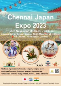 The Consulate-General of Japan in Chennai, and ABK-AOTS DOSOKAI, Tamilnadu Centre, are organising a one-day mega event Chennai Japan Expo 2023 on 25 November from 11 am at VR Chennai, Anna Nagar, to introduce the culture of Japan.
