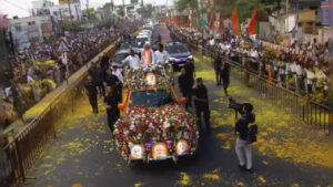 As Modi began his roadshow in an open vehicle, people who gathered on both sides of the road showered flower petals on him and chanted slogans hailing him. Several of them danced and waved at him enthusiastically. This is the first time Modi has held a road show in Kovai.